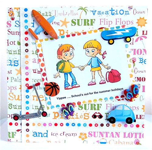 The background paper and ribbons are DCWV from a summer pack bought a few years ago.I used a variety of 3D stickers, including two sets of lovely plastic flip flops. I used an 8 x 8 card blank as I wanted plenty of space for all the bits and pieces.