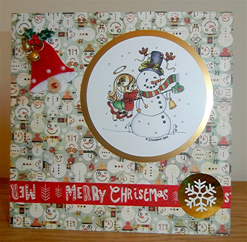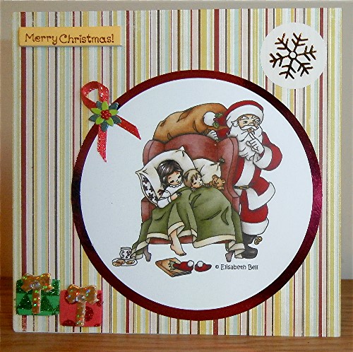 This is my second card for my CHNC challenge 313: use a sentiment. The image is another lovely pre-coloured Elisabeth Bell topper. Because I wanted to make quick cards I cut quite a few circles etc on my Scan n cut and used them for matting. The background paper is Basic Grey, the little sparkly presents and festive bowwere from The Works.