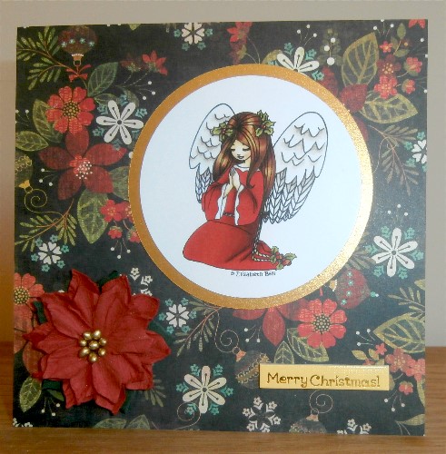 This is my third card for my CHNC challenge 313: use a sentiment. The image is another lovely pre-coloured Elisabeth Bell topper. Because I wanted to make quick cards I cut quite a few circles etc on my Scan n cut and used them for matting. The background paper is Basic Grey, with the simple addition of the poinsettia from Hobbycraft and the sentiment.