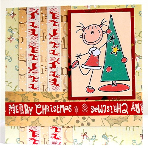 The foiled background paper was a magazine freebie. The image is a retired Bugaboo Stamps one called AKV girl xmas tree - Bugaboo Stamps kindly sponsor our CHNC challenge extra every month - another reason to click on the challenge link to find out what's on offer for the randomly selected winner.