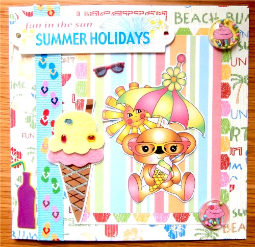 Papers and ribbon are from an old selection from DCWV, other bits from stash including the lovely refreshing 3D ice cream sticker and the little shaker sticker circles from Paperchase.