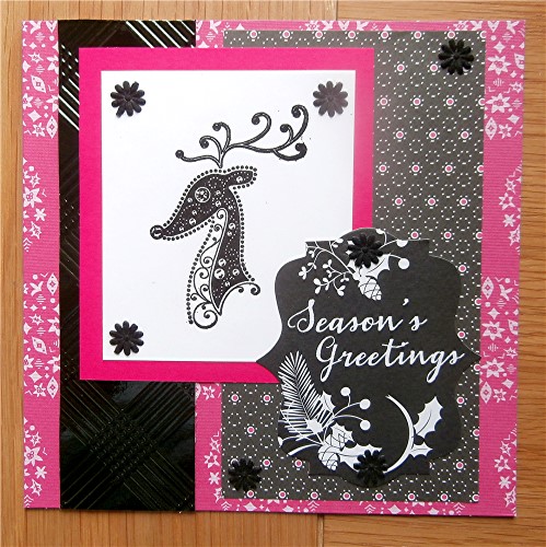 For my card I used the lovely Inkadinkadoo reindeer stamp, inked with versafine onyx black and heat embossed with detail black powder.. Various offcuts were used, including the piece of embossed shiny black card. The greeting tag was from an unknown set I purchased long ago and the little black flowers were cut from some sticky ribbon.