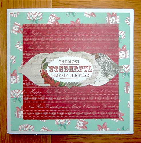 A quick Christmas card made with a piece of unknown background paper (from a magazine freebie I think) and other pieces from Craftwork Cards Christmas past collection.