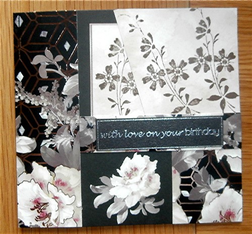 Some time ago I bought some boxes of notecards from TK Maxx with the idea of cutting up the boxes and using parts of the cards and envies to upcycle. This is one of the cards I've made, adding some stamping using Penny Black's floral silhouette inked with memento rich cocoa and adding a Kanban sentiment.