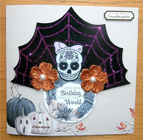 As I said in my previous post, I was commissioned to make Halloween birthday cards for twins born on 31 October - now grown up. This is the 8 x 8 card I made for the granddaughter, using papers and greeting topper from The Paper Boutique Wickedly Wonderful collection. The main topper was on a hairband bought from Primark + shiny copper flowers with pearls.