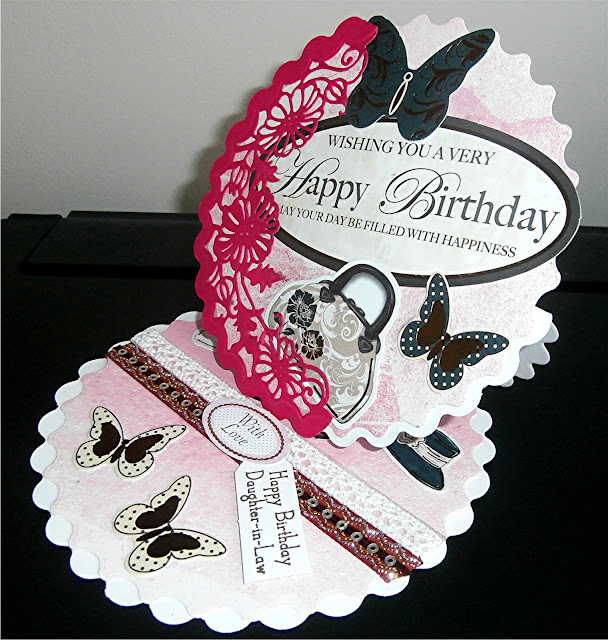 This is a commissioned card for a friend to give to her daughter-in-law. I used backing card and elements from Kanban, cutting the easel, mat and side floral piece using a Die'sire create-a-card floral easel set from Crafter's Companion. The floral piece was cut from a pearlescent card. I added lace and ribbon to the base with the sentiments to act as a stopper.