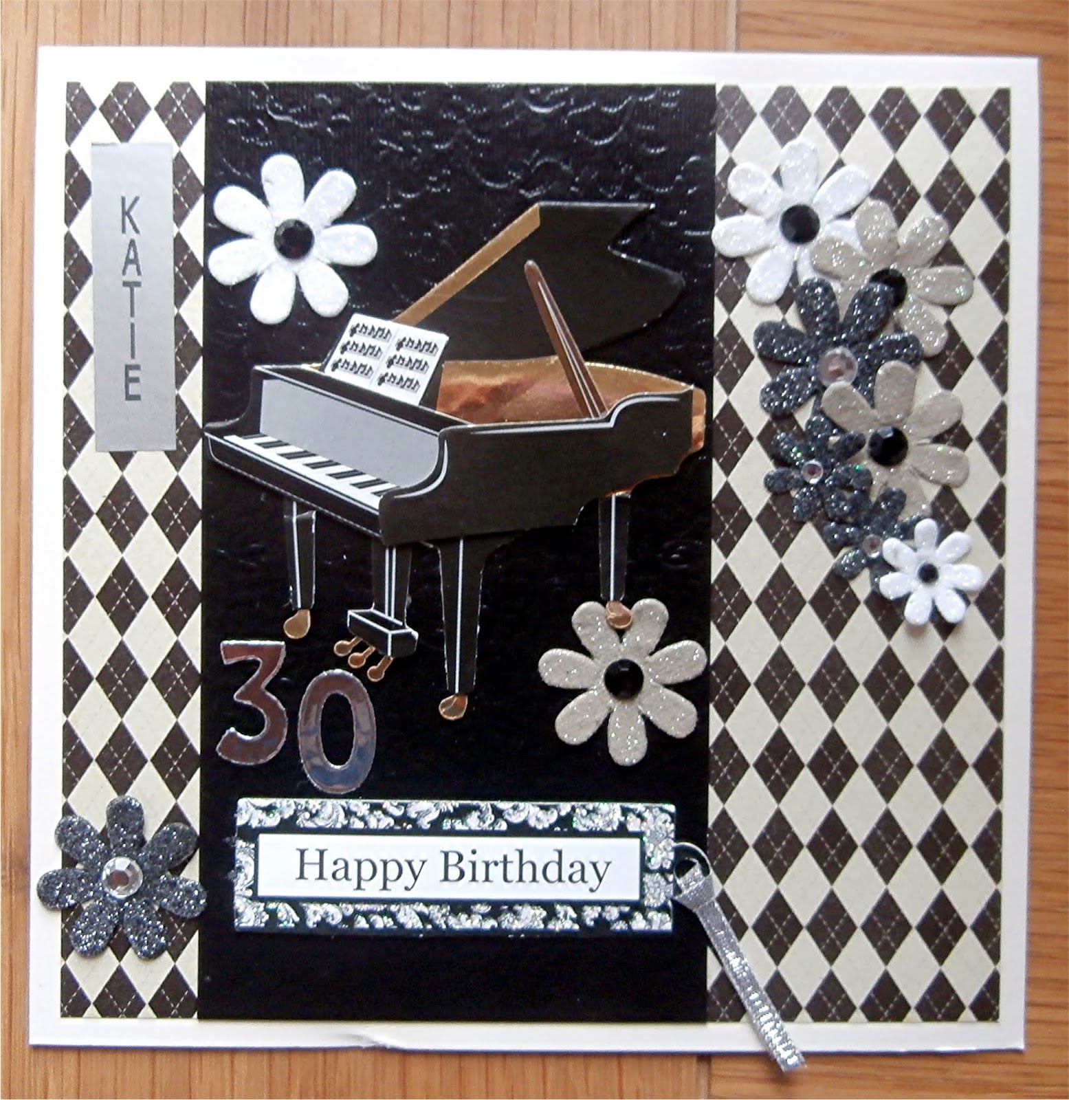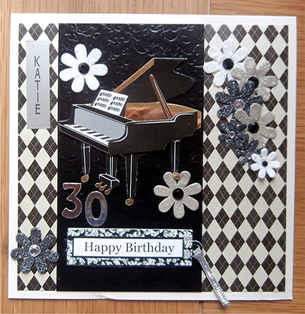 This was a commissioned card for a 30th birthday for a musical young lady, using some embossed black card and offcuts of the harlequin paper, the lovely piano sticker and flowers etc.