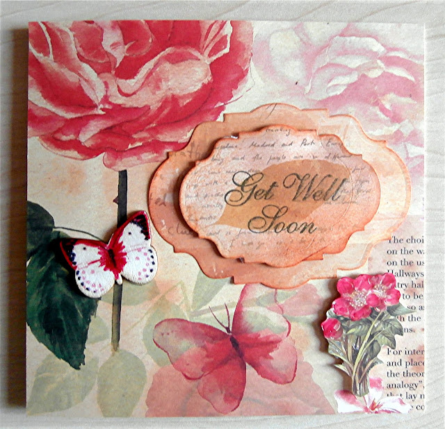 A get well soon card made recently with an offcut of paper from a magazine freebie, with the cut out flower from another piece and additional raised up flowers and a butterfly. I used two offcuts of paper to print the sentiment, cut and emboss and a larger die to mat it, edging with spiced marmalade distress ink.