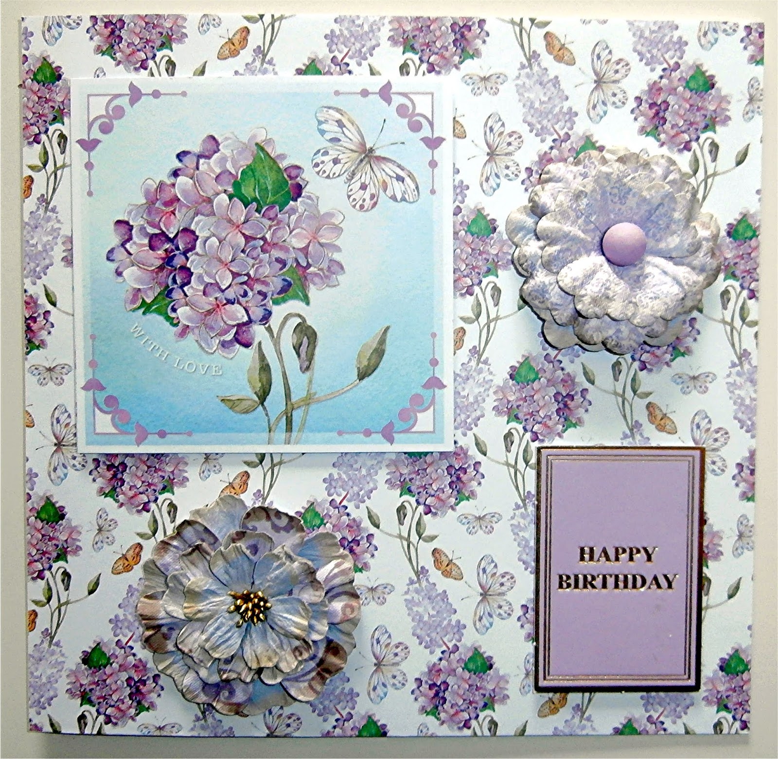 Another 8 x 8 card made recently with paper and topper from The Paper Boutique, with the addition of the lovely flowers from Hobbycraft that had been inked on the edges and the Happy Birthday sentiment panel.