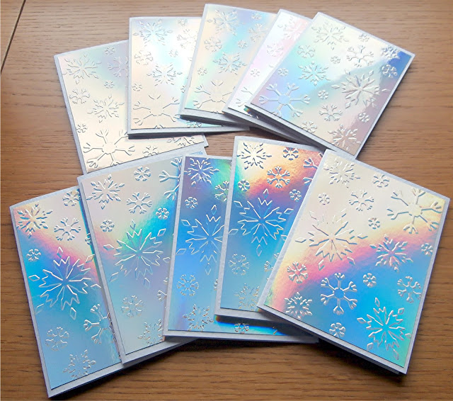 Some sets of cards made some time ago using an embossing folder that I've had for a long time - very useful to make a variety of cards quickly using holographic silver mirror card and matt gold. They were mounted open to matt silver embossed card with the peel off sticker sentiments added. And another set using holographic silver mirror card with no sentiment.