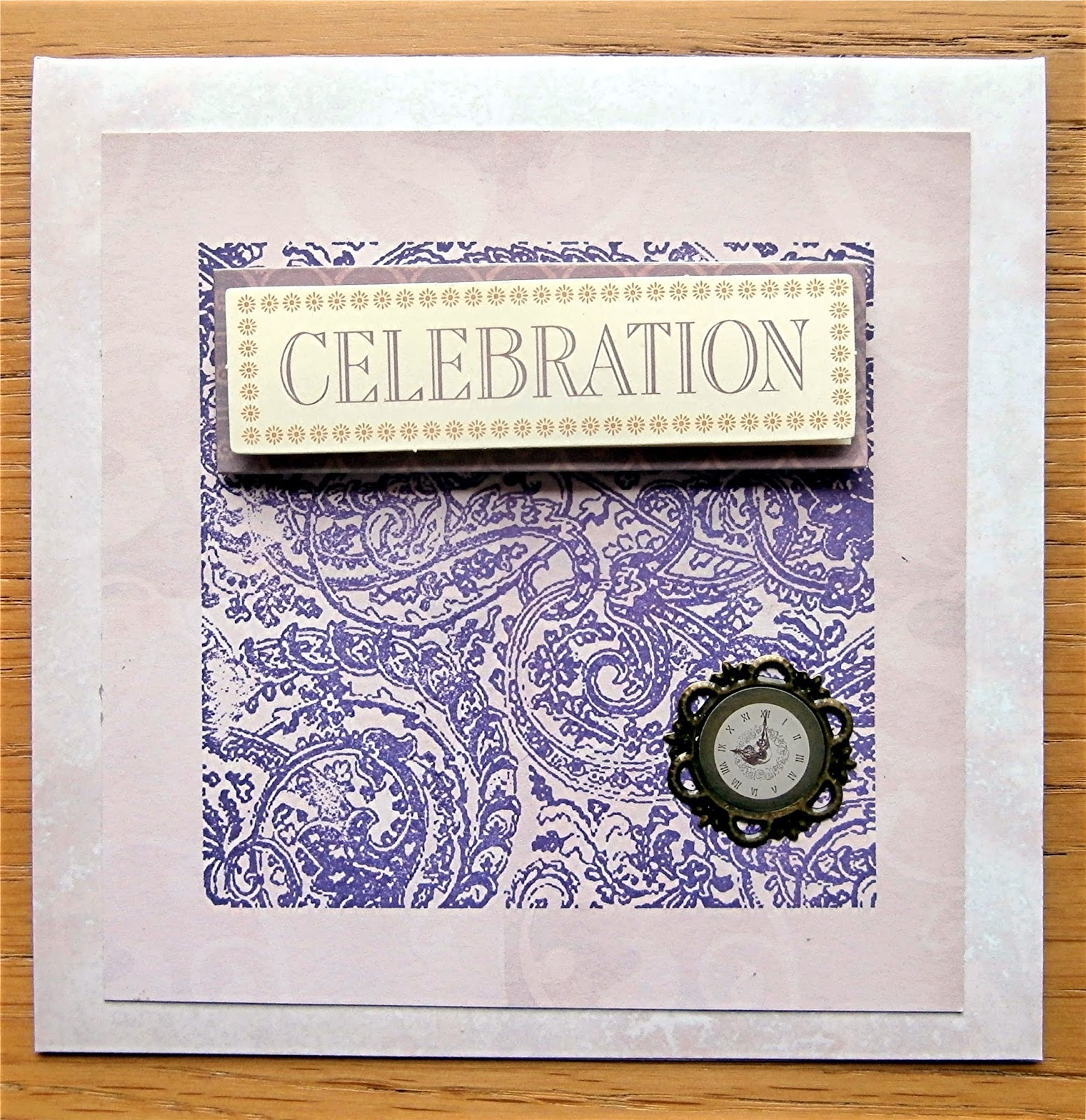 I inked the Tim Holtz stamp with memento grape jelly on to the piece of pink paper that has a faint pattern on it (difficult to see here) and then on to the card blank. Not sure where the little clock came from. This card could be used for any kind of celebration.