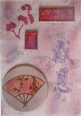 At last I've managed to do ATCs for the oriental swap on CBC. I used DCWV Far East papers and bits and HOTP stamps, overlaying with vellum: