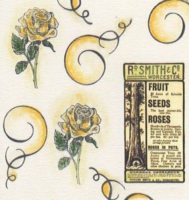 I've chosen an old ad (it's a rub on) and then used rose and swirl stamps and pastel pencils with Sansodor: