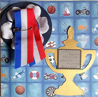 The background paper is one of the English Paper Company Men at work papers. The cup is a die cut - and the 'plaque' on it says Congratulations a few times. I made the rosette with a couple of circles, a flower and the obligatory ribbon and pin (well, I hope it looks a bit like a rosette - lol!):