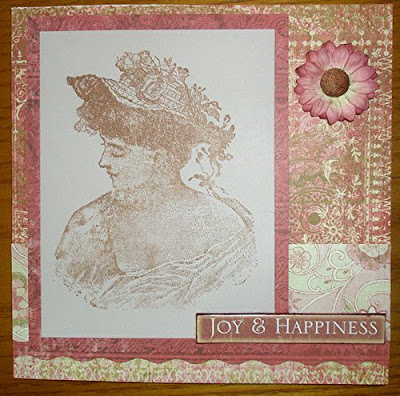 I used a newly acquired foam stamp (have bought a few sets of these recently from QVC - not bad quality for the money) and stamped on to a very subtle pale pink card (although it looks more white in the photos because of the poor light when taking them). I used Archival ink Sepia for the stamping. I then rounded the corners and inked the edges and across the hat and dress with a pink ink pad. The card blanks are from pda's designer range - light brown stone.