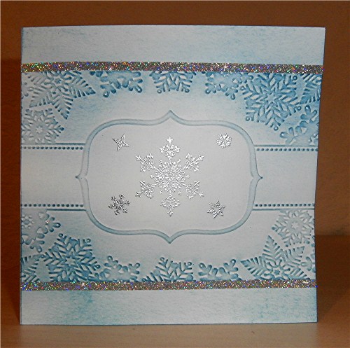 For my card I used an embossing folder to decorate the middle of my card blank and then brushed broken china distress ink over the embossed and surrounds using an inkalicious brush. I added some Paper Cellar silver glitter strips top and bottom, then inked some Wild Rose Studio snowflake stamps with versamark and heat embossed with detail silver powder.