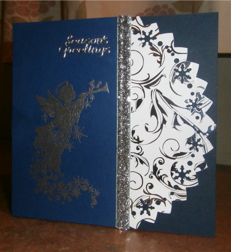 The silver and blue mirror card panel was from my offcuts box, mounted on to an A5 dark navy blue cardblank.