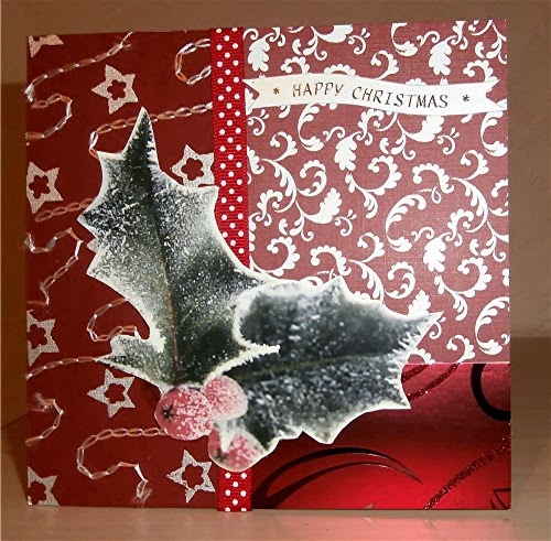 It was Maureen' s turn to choose the theme for today's Christmas Card Club challenge and she asked us to recycle something on to our card. I cut out a circle around a wreath that was rescued from an old card. I layered an offcut of vellum that has shiny embossed lettering, adding a piece of ribbon to match with the glittered holly berries. I wrapped the vellum around the back of the card, edging with a piece of the red ribbon.