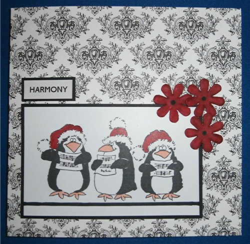 CAS card using a piece of Teresa Collins Christmas home background paper and PB caroling penguins stamped with memento tuxedo black, coloured with copics. Flowers were white, coloured with copic pen so that they matched the hats. 'Harmony' was generated on my dymo letratag. This is another card for my CHNC challenge 113: one word is sufficient.