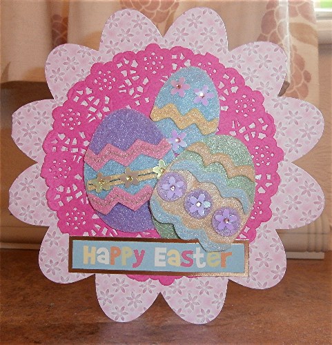 Two more Easter cards featuring eggs on fancy shaped card blanks, set off by doilies. The eggs and flowers are sparkly felt from Hobby Craft.
