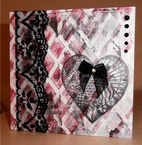 I used the Singles zentangle heart stamp by Sam Poole that I bought in Eastbourne (from That Craft Place - a super shop and also a Facebook group). The black lace was also from there. The black bow and black pearls are from stash.