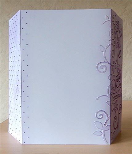 This is a card created using an A4 embossing folder from Craftwell (for the eBosser). Having embossed the A4 card I brushed with dusty concord distress ink. For the inside of the card I used two pieces of paper from HOTP Jacie's vintage papers (I've long neglected these), stamping on the inner one using a couple of Dawn Bibby stamps by Personal Impressions, inking with dusty concord.