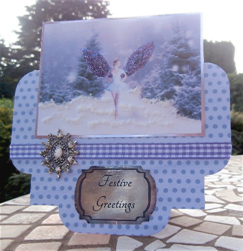 I've used another internet freebie fairy picture on to which I added some polar white flower soft and some Art Institute blue angel glitter. I mounted the image on to a piece of mirror card and added the Anna Griffin sentiment. I chose the shaped card blank to pick up the colour tones of the deer. The sparkly net is a couple of snippet pieces and sparkly rhinestones from Poundland.