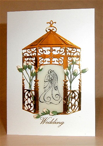 I wanted to use my new Spellbinders D-lite gazebo die and what better than to make a wedding card, but the dilemma was: what to put in the middle of the gazebo. I had some die cuts of bride and groom, but they were too big. So I dug out some old shrink plastic and took a gamble. I stopped with my old Anita's favourite wedding stamp and then used the heat gun to shrink the plastic. I couldn't believe it when it fitted the space, although I did have to chop off the sides a bit (not sure whether it's done the blade much good on my guillotine).