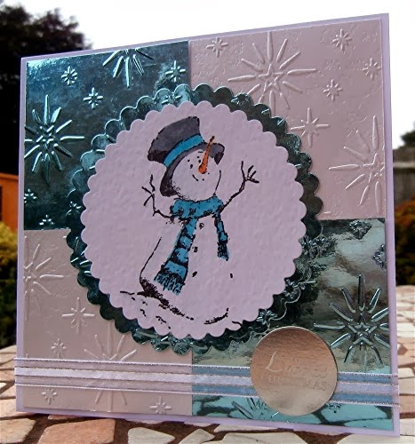It's a while since I made a Christmas card featuring a snowman, but that's what Sue J asked us to make for today's Christmas Card Club challenge. So I thought it was about time I used one of my favourite Stampotique stamps by Jo Capper-Sandon, colouring just a bit with spectrum noirs. I stamped this on to an offcut piece of hammered white card to give a bit of texture. The scalloped circles were cut with nesties. The backgrounds were made with my eBosser with the lovely Embossaliious 'star of wonder 8 x 8 embossing folder. The pieces used were all snippets left from earlier makes, so I'm into the playground for Pixie's crafty snippets week 91.
