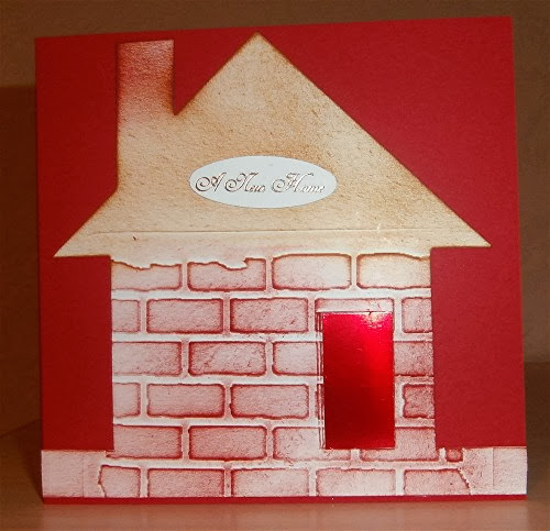 I masked off the roof so that I could run the 'wall' through my cuttlebug with the bricks embossing folder and I then swiped the embossed surface with fired brick distress ink, using the same at the top of the chimney with some brown corduroy lighted brushed on the roof. With the addition of the sentiment and the mirror card door, the card was finished.