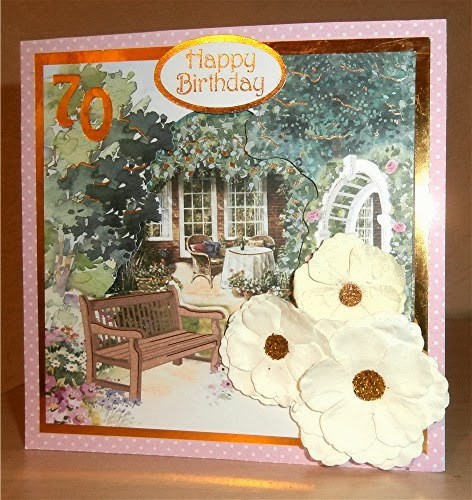 I was asked to make a birthday card for a 70 year old featuring a garden and flowers. I used a spotted pink background paper, on to which I matted gold mirror card and then used some Kanban pieces to create three layers of invertage for a garden scene. The flowers are craftime.