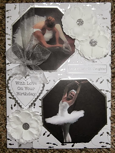 This is a card that I was asked to make for a daughter's birthday, with a dance theme. The background card is 'dancing feet' by Kanban and the pictures are Kanban too. Flowers are Craftime. This is an A5 card to accommodate the die cut images.