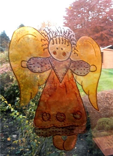 I used Floppy Latte 'angel' digital image, printed on to a sheet of heat resistant acetate and then quickly heat embossed with clear powder. I then used alcohol inks to colour - butterscotch, terra cotta and currant. This 'stained glass' angel now decorates the window of my craft room.