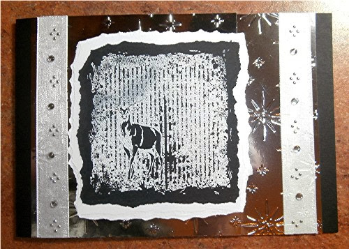I inked the IndigoBlu 'stag night' stamp with Elzybells sugar candy pigment inkpad on to black card heat embossing with detail white powder. I then tore round the black card, mounted on to white and tore around that before sticking on to the front of the card slightly overlapping on the right hand side. I won a £20 voucher for the Lisa B Designs October challenge and the 'stag night' stamp was one of the items I chose, along with the 'bare forest' IndigoBlu stamp and Vive la Plume by June Gill.