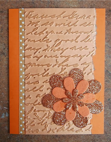 March 2013: Orange script - I've chosen this card to remind myself that I ought to use orange more often - a colour that I don't usually use very much. And I like the texture created by the script embossing folder as well as the simple layering of the flowers - the kind of card that is useful for any occasion:
