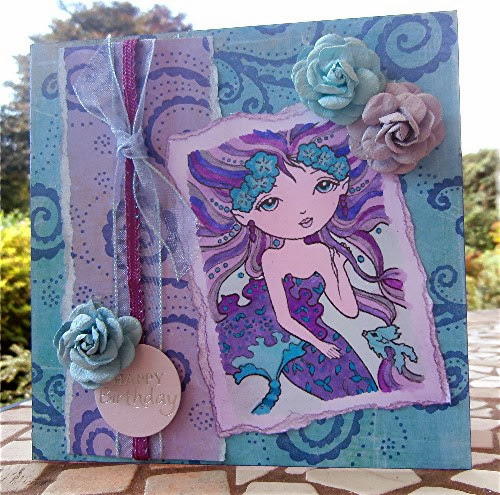 August 2013: the Sweet Pea stampers fantasy challenge - I was delighted to be asked to join the Sweet Pea stampers Design Team earlier in the year. This card was for their 'fantasy' challenge. I love it because of the colours, the textures and, of course, the lovely Jasmine mermaid digi by Elaine Cox:
