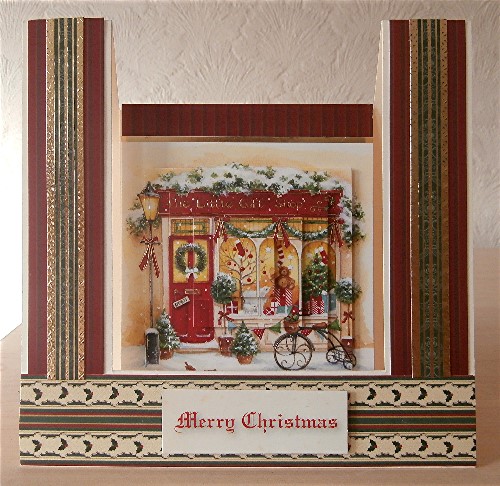 Once again, I've used a ready scored step card from Kanban adding card and elements from Hunkydory kits, including the decoupaged picture of The Little Gift Shop.