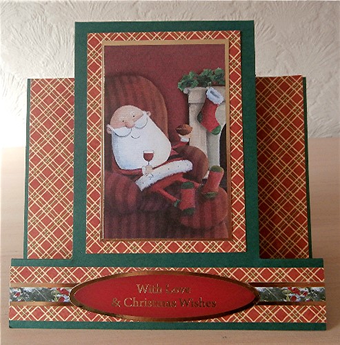 This is my first design card for CCAYR March challenge: step cards. I cheated a bit because I was running short on time, so I used a ready made Kanban step card on to which I matted some offcuts of Graphic 45 Christmas past collection 'carol of the bells' - I'm sad that these were the last pieces of this (except for a tiny bit that probably won't get used now). The picture of Santa relaxing with his tipple and mince pie is an old Kanban one and the strip across the bottom and the sentiment are Hunkydory.