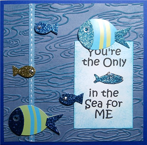 I printed out the digi and filled in the fish with stickles to match the Creative Expressions 3D glittered fish stickers that I added to the card. The background was created with a Sheena Douglass embossing folder ran through the eBosser and brushed with peacock feathers distress ink, as were the edges of the image card. I used a piece of stitched ribbon to join two pieces of embossed card together, mounting everything on to a bright blue card blank.