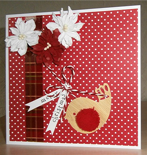 It was Margaret's turn to choose the theme for the Christmas Card Club's fortnightly challenge for today and she asked us to feature a robin. I received a lovely card for Christmas that had a cute little robin with a fuzzy wuzzy feelie red breast and I couldn't help but recycle him on his card. I hope that whoever eventually gets this card will love him as much as I do.